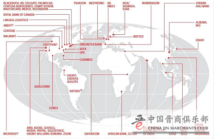 贝莱德(BLACKROCK)、碧迪医疗(BD)、高露洁-棕榄(COLGATE- PALMOLIVE)、科迪华农业科技(CORTEVA AGRISCIENCE)、汉瑞祥(HENRY SCHEIN)、万事达卡(MASTERCARD)、默沙东(MERCK)、再生元、加拿大皇家银行(ROYAL BANK OF CANADA)、LINEAGE LOGISTICS、雅培(ABBOTT)、CENTENE、沃尔玛、培生(PEARSON)、美敦力(MEDTRONIC)、百威英博(AB INBEV)、宜家/斯堪斯卡合资公司(IKEA/SKANSKA)、瑞典钢铁公司(SSAB)、蒙德拉贡(MONDRAGON)、约旦阿赫里银行(JORDAN AHLI BANK)、FOOTPRINT、onEUNITED BANK、美国银行、UPS、CHENMED、沃旭能源(ØRSTED)、牛尾(USHIO)、阿里巴巴(ALIBABA)、蔚来(NIO)、高通(QUALCOMM)、GRUPO ENERGÍA BOGOTÁ、NATURA、西麦斯(CEMEX)、微软(MICROSOFT)、AMD、ADOBE、谷歌(GOOGLE)、英伟达(NVIDIA)、PAYPAL、赛富时(SALESFORCE)、UDEMY、WILLIAMS-SONOMA、ZOOM、SAFARICOM、非洲银行(AFRICAN BANK),ZUTARI、RELIANCE JIO,印度血清研究所(SERUM INSTITUTE OF INDIA)、GRAB、东西种子公司(EAST- WEST SEED)、GREEN MONDAY、平安保险(PING AN INSURANCE)