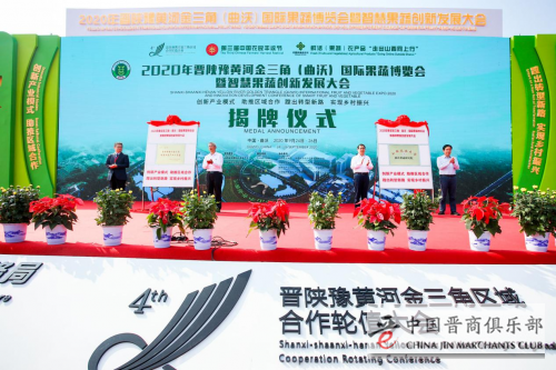 中国工程院院士、西北农林科技大学植保学院教授康振生、山西农业大学党委书记廖允成为“山西农大曲沃果蔬研究院”揭牌;农业农村部贸易促进中心副主任宋聚国、山西省供销社总会计师郝利才为“晋陕豫黄河金三角智慧果蔬产业示范区”揭牌。