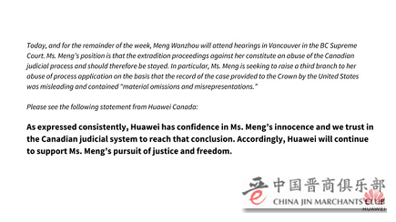 华为公司一直认为,孟晚舟女士是无辜的,并相信加拿大司法系统能够作出同样的结论。华为公司将继续支持孟女士寻求自由与公正。