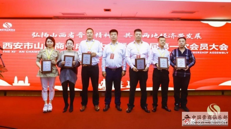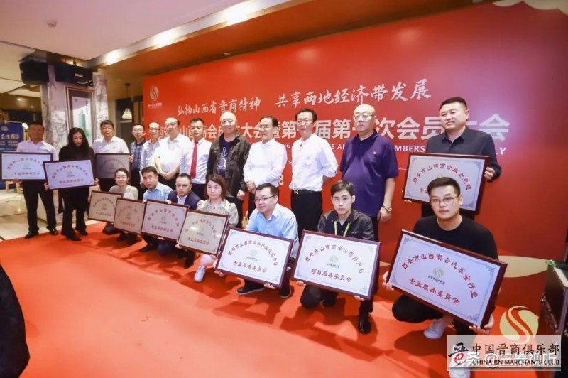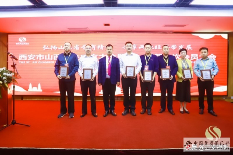西安市山西商会会长张建军为本届西安市山西商会名誉会长:西安世纪金花集团董事长吴一坚、山西广誉远龟龄集酒业有限公司董事长白励铭、马氏集团董事长马胜利、人民美术副主编张新民、西商联合会会长于建安、陕西房产创始人张国政、陕西省人社厅处长张如顺、西安市委政策研究处处长孙紫阳、CCTV央视春红旗车特约表演车手挑战者创始人加强、欧科贝特热力能源有限公司董事长李鹏、一带一路工委副主任张长生、中国西部国际车城董事长王润朝、欧洲中国文化教育促进基金会外联委员会秘书长张俊霞、中国管理科学研究院行业发展研究所产业联盟智慧研究中心主任张红战进行授牌并颁发证书。