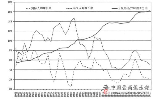 1960年代以来,美国医疗卫生费用持续增长,年均增长率长期高于GDP增速,到1990年已达6994亿美元,较30年前增加了25倍。