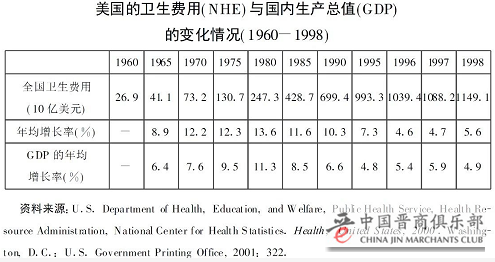 1998年,美国医疗卫生费用高达11491亿美元,人均4270美元,比经济合作与发展组织(OECD)成员国的平均数高出一倍多。同年,美国医疗卫生开支占GDP的比例达14%,比OECD的平均值高6个百分点。