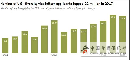 2005年至2017年申请“多元化移民签证计划”人数 图源:皮尤研究中心