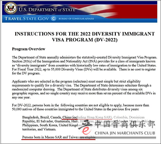 据美国国务院领事事务局网站消息,今年的“多元化移民签证计划”会发出5.5万张签证。中国内地、加拿大、印度、韩国、越南、英国(不包括北爱尔兰)等国家或地区,因过去5年间有超过5万人移民美国,不符合申请资格。