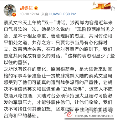蔡讲话一结束,大陆环球时报总编辑胡锡进就发微博评论,说蔡英文的表态“明显少了些以往的嚣张”。之所以有这样的变化,胡锡进认为原因很简单,“是大陆近来动真格的军事斗争准备,让一贯放肆挑衅大陆的蔡英文当局感受到了他们可能真的遭到战争惩罚的严重性。”
