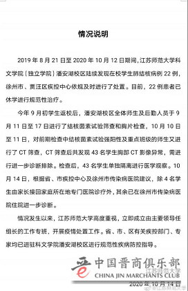 14日晚,@江苏师范大学 发布通报称,2019年8月21日至2020年10月12日期间,江苏师范大学科文学院潘安湖校区陆续发现在校学生肺结核病例22例。目前,22例患者已休学进行规范性治疗。