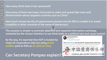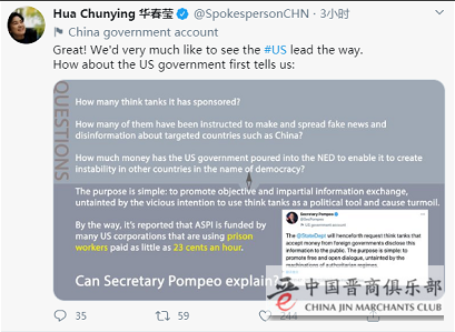 华春莹贴出一张图片质问道:美国赞助了多少智库?其中有多少受命制造和传播关于中国等国家的假新闻?华春莹尤其点出其中臭名昭著的“美国国家民主基金会”(NED),要求蓬佩奥给出解释。
