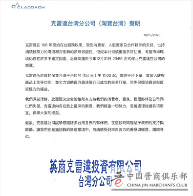 据了解,淘宝台湾结束营运的声明,由代理集团淘宝品牌在台湾营运的克雷达公司所发布。淘宝台湾退出台湾市场,为克雷达公司董事会决议。淘宝台湾于去年10月开站,为避开法令对于陆资的限制,淘宝台湾是由阿里巴巴集团透过品牌授权英商克雷达投资台湾分公司营运,其中包括商城的B2C模式以及个人卖家的C2C模式。