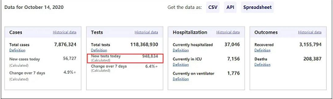 美国新冠疫情追踪网站 Covid Tracking Project数据显示:10月14日美国新冠检测约95万份