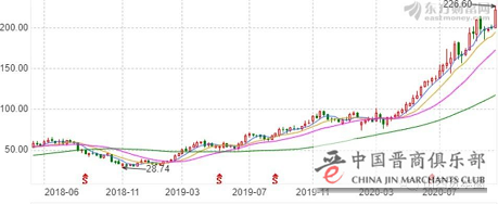 当然,随着汾酒集团“大招频出”和山西汾酒业绩的强势飘红,山西汾酒股价便开始强势复苏,虽偶有波动但整体一路飙涨,股价与市值屡创新高:2019年8月公司股价创出历史新高;2020年3月触及100元/股“大关”;2020年5月总市值突破千亿元,并登顶山西板块市值“第一股”;2020年9月,公司股价再度突破200元/股;而如今则离2000亿元市值仅一步之遥。