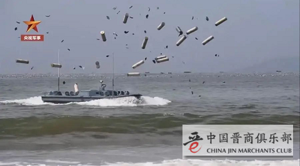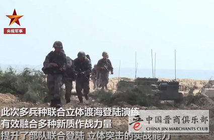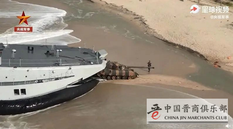 央视军事15日放出的解放军抢滩登陆视频中,两栖装甲车漂浮在海面上,相继进入071型综合登陆舰,气垫登陆艇上则载着战车,对目标滩头实施登陆,解放军士兵以战车作为掩护,朝目标物挺进。