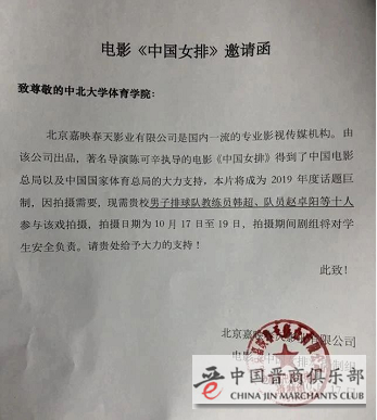 2019年10月17日,中北大学体育学院收到来自北京嘉映春天影业有限公司和电影《中国女排》摄制组的联名邀请信。信中表明,因拍摄需要,邀请中北大学男子排球队参与电影拍摄,拍摄时间为10月17日到19日。