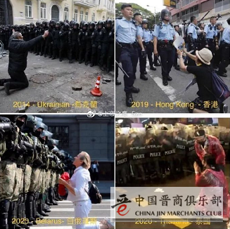 有网友发现,各地示威者的“摆拍”存在相似之处 图自:微博