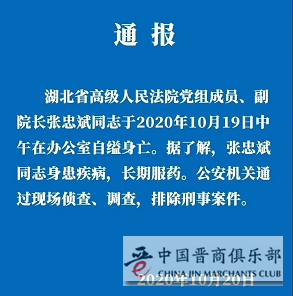 今早9点时许,据湖北省高级人民法院通报,湖北省高级人民法院党组成员、副院长张忠斌同志于2020年10月19日中午在办公室自缢身亡。据了解,张忠斌同志身患疾病,长期服药。公安机关通过现场侦查、调查,排除刑事案件。