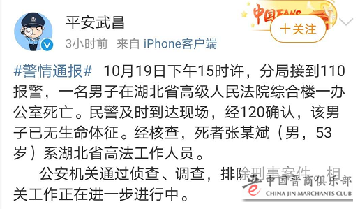 据武汉市武昌区公安分局官方微博@平安武昌 通报,10月19日下午15时许,分局接到110报警,一名男子在湖北省高级人民法院综合楼一办公室死亡。民警及时到达现场,经120确认,该男子已无生命体征。经核查,死者张某斌(男,53岁)系湖北省高法工作人员。