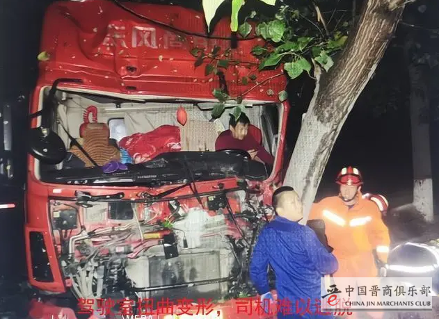 画面中货车的外壳都已经脱离,暴露出内部结构,驾驶室弯曲,驾驶员难以脱身。