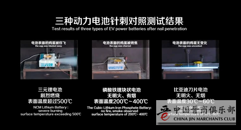 在汉上市前,比亚迪就拿刀片电池进行过“难度之高堪比珠穆朗玛峰”的针刺试验。试验结果显示,刀片电池在被刺穿仅仅冒烟、温度只有几十度,而三元锂电池,被刺穿后就剧烈燃烧。尽管三元锂电池易燃易爆的性质早已在公众的意料之中,但刀片电池出色的安全性还是引发了人们的广泛讨论。