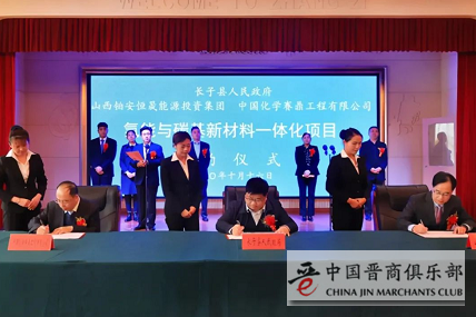 赵永进、刘玉平、施福富分别代表长子县人民政府、山西铂安恒晟能源投资集团有限公司、中国化学·赛鼎工程有限公司共同签署了项目协议。