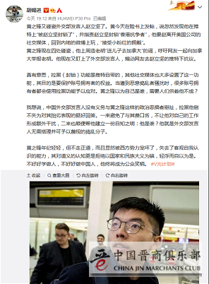 值得注意的是,为宣传其乱港行为,黄之锋一段时间以来到处在网上“碰瓷”,就在上周,他还对胡锡进进行了恶意造谣和抹黑。
