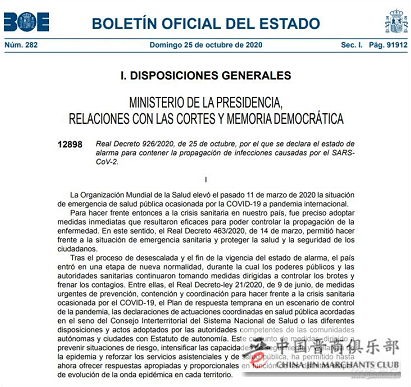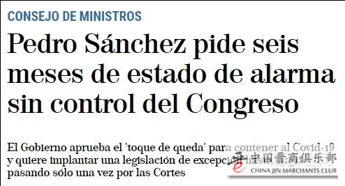 有别于此前的全国紧急状态,当天晚间《西班牙国家官方公报》公告显示,首相府呼吁将本次全国紧急状态移交给西班牙政府主导进行。此前按照西班牙宪法的规定,全国紧急状态每过15天若需要延长,必须向议会申报。而此次佩德罗·桑切斯政府希望首轮15天的紧急状态,一举延长6个月,至明年的5月。期间紧急状态的“延长申请”工作,无需交付议会,由内阁会议决定即可。