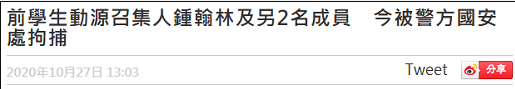 据香港多家媒体10月27日报道,“港独”组织“学生动源”前召集人钟翰林、前成员何忻诺及陈渭贤于今日被港警国安处人员拘捕。