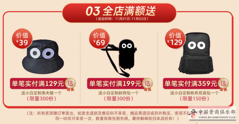 不仅有满199-120元专区,更有11月1日限时限量一元秒杀活动,也有全店满额送小白IP周边礼品(定制渔夫帽、斜挎包、双肩包)等众多活动疯狂来袭!