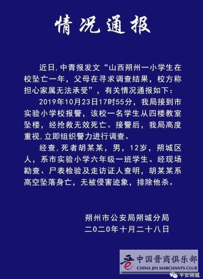 通报称,近日,有媒体发文“山西朔州一小学生在校坠亡一年,父母在寻求调查结果,校方称担心家属无法承受”,有关情况如下: