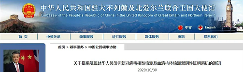 例如,中国驻法国大使馆10月30日发布的通知显示,为减少疫情跨境传播,自2020年11月6日起,自法国搭乘航班赴华的中、外籍乘客,须凭登机前2天内在法国采样的新冠病毒核酸检测阴性证明和血清特异性IgM抗体检测阴性证明登机,两者缺一不可。
