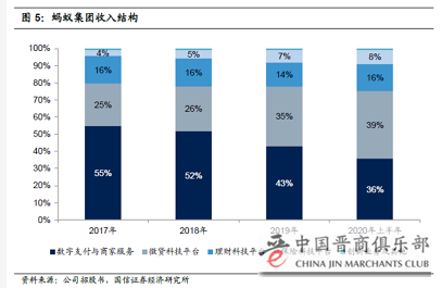 蚂蚁招股书显示,集团的主要收入来自四个板块,分别是数字支付与商家服务、微贷科技平台、理财科技平台和保险科技平台。而下图可以直观看出,支付板块所占比重有所降低,微贷、理财和保险三大板块所占比重在持续上升。