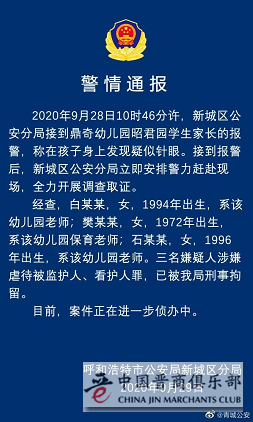 9月29日,呼和浩特市公安局新城区公安分局发布消息,该幼儿园三名老师因涉嫌虐待被监护人、看护人罪,已被警方刑事拘留。