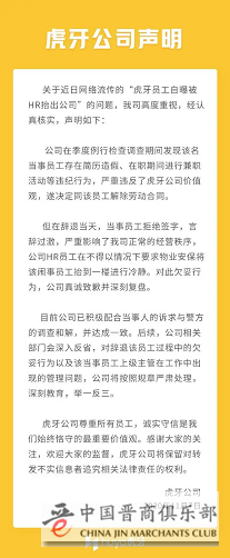 虎牙方面表示,对此欠妥行为,公司真诚致歉并深刻复盘。目前公司已积极配合当事人的诉求与警方的调查和解,并达成一致。后续,公司相关部门会深入反省,对辞退该员工过程中的欠妥行为以及该当事员工上级主管在工作中出 现的管理问题,公司将按照规章严肃处理,深刻教育,举一反三。