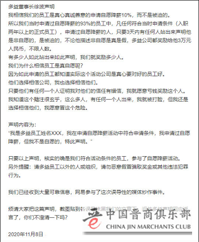 11月8日,多益网络以董事长徐波的名义再次发布声明称,相信员工“是真心真诚善意的申请自愿降薪10%,而不是被迫的。”