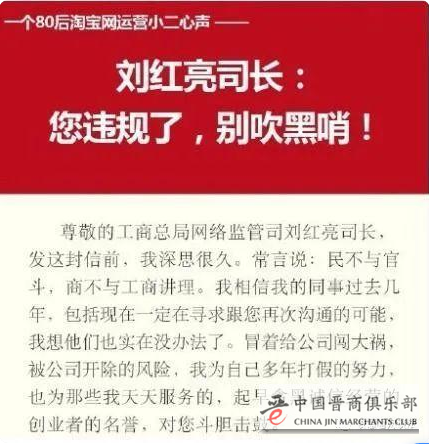 当时,淘宝以“店小二”名义在微博贴出“大字报”,不仅质疑监测结果的抽样数量、监测数据和监管程序,并且“破天荒”以“XXX司长:您违规了,别吹黑哨!”的喊话形式,公开表达对监管部门做法的不满。