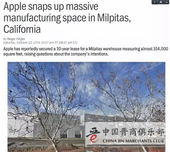 10月21日,消息传来,苹果公司已经获得了加州一个仓库的10年租约,这一仓库面积可不小,约2.92万平方米。