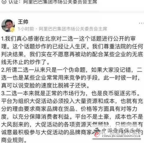 就在去年,2019年10月,阿里巴巴集团市场公关委员会主席王帅,还在微博上公然宣称:“二选一本来就是正常的市场行为”。