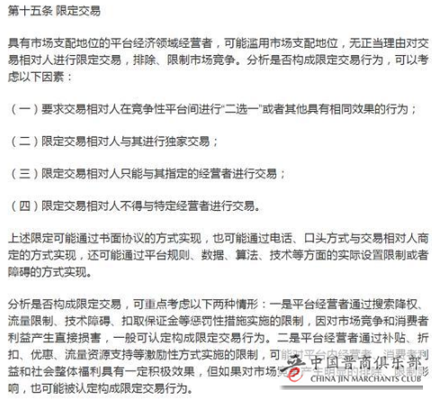 这个政策内容虽然很长,但是业内人士直接明眼看出,核心是在第十五条“具有市场支配地位的平台经济领域经营者,可能滥用市场支配地位,无正当理由对交易相对人进行限定交易,排除、限制市场竞争。”