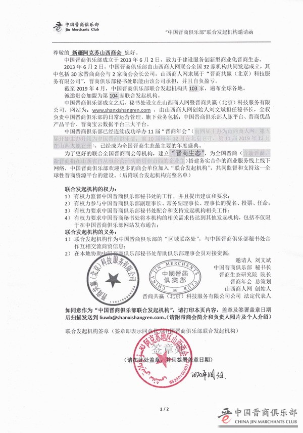 晋商俱乐部秘书处收到新疆阿克苏地区山西商会加盟为晋商俱乐部联合发起机构的合作意愿,回执如下: