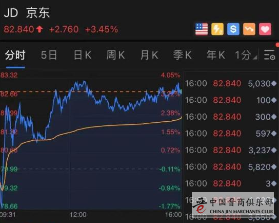 京东开盘也一度跌超1%,收涨3.45%。