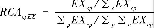 其中,RCAcpEX为c国p商品的显性比较优势指数;EXcp为c国p商品的出口额;ΣcEXcpΣcEXcp为c国全部商品的出口额;ΣpEXcpΣpEXcp为世界上p产品的出口总额;ΣpΣcEXcpΣpΣcEXcp为世界所有产品的出口总额。