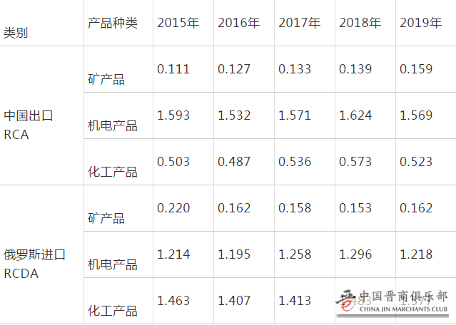 表1 2015-2019年中国出口显性比较优势指数、俄罗斯进口显性比较劣势指数