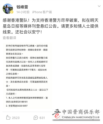 钱峰雷表示,自己11月14日凌晨于香港湾仔道皇朝会门口被四名中国籍凶徒袭击,“现悬红协助警方缉凶及将凶徒绳之以法。”钱峰雷称,任何人士若能提供可靠消息或证据,如银色私家车车牌片段等等,可获奖赏最高港币1000万元,或按比例之悬红金额。