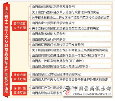 山西是国务院批准设立的国家资源型经济转型综合配套改革试验区,是全国第一个全省域、全方位、系统性的国家级综合配套改革试验区,同时还承担着能源革命、企业投资项目承诺制、标准化等多项国家改革试点任务。省十三届人大常委会结合山西改革实际,积极探索创制性立法,巩固改革成果、引领改革进程。截至10月底,我省“量身定制”的创制性法规已达16件,占到新制定法规数的55%。其中转型综改领域12件,已经通过9件。