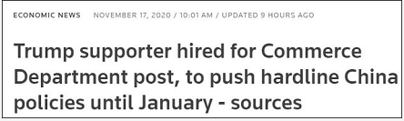 值得注意的是,彭博社等外媒16日报道称,据美国政府一位高级官员透露,特朗普计划在剩下几周任期内对中国采取几项新的强硬举措,让“当选总统”拜登“束手束脚”。