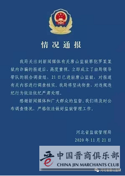 河北省监狱管理局21日发布通报称,目前已成立由该局相关领导带队的联合调查组进驻唐山监狱彻查,对违规违纪行为将依法依纪严肃处理,并将及时公布调查情况。