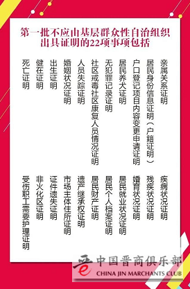 第一批不应由基层群众性自治组织出具证明的22项事项包括:亲属关系证明、居民身份信息证明(户籍证明)、户口登记项目内容变更申请证明、居民养犬证明、无犯罪记录证明、社区戒毒社区康复人员情况证明、人员失踪证明、婚姻状况证明、出生证明、健在证明、死亡证明、疾病状况证明、残疾状况证明、婚育状况证明、居民就业状况证明、居民个人档案证明、居民财产证明、遗产继承权证明、市场主体住所证明、证件遗失证明、非火化区证明、受伤职工需要护理证明。