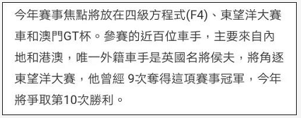 与蒙特卡洛齐名并列全球经典街道赛,同时也是亚洲赛车界年度盛事的澳门格兰披治大赛车本月20日开幕。