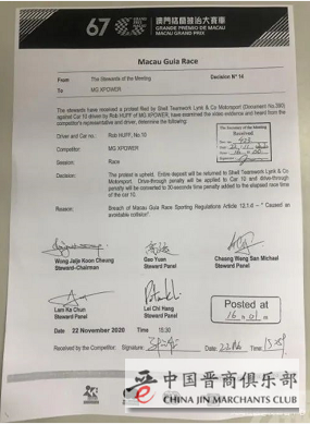 组委会经过研判,最终裁定罗布·赫夫的超车行为导致了一场“可避免”的碰撞事故发生,对其罚时30秒。这样一来,罗布·赫夫的成绩从第1名滑落至第23名,这使得原本第2名的张志强成为了史上第一位在东望洋大赛中夺冠的中国车手。