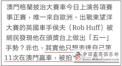 直播画面显示,罗布·赫夫站在领奖台上,首先做出一个“十”的手势,代表自己成功拿到“十冠王”的称号。随后他又变换手势,双手各伸出一根手指,代表“十一”。因为他在此前一天的排位赛中也是拿到了头名,这样一来自己便是第十一次站上澳门格兰披治大赛车领奖台的最高位置。