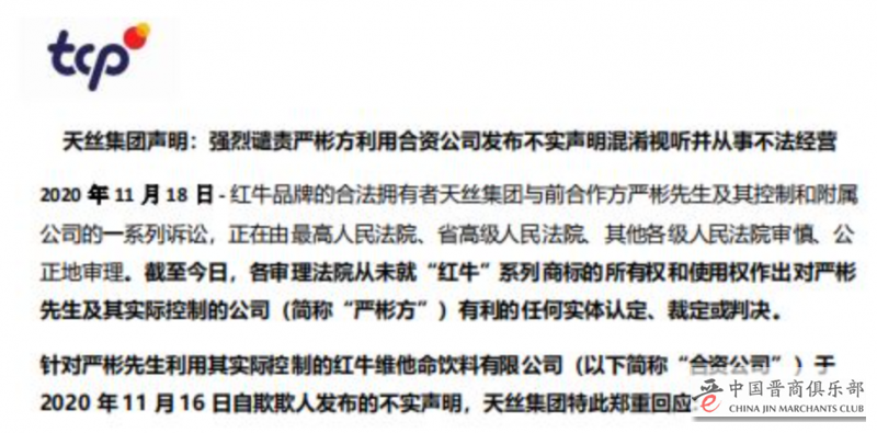 几天前,快消君曾报道过天丝医药保健有限公司(以下简称:天丝)和华彬集团(以下简称:华彬)之间发生的争执事件,起因是后者在11月16日发布了一条表意模糊的公告,并宣称“人民法院就中国红牛五十年内在中国境内享有独家生产、销售红牛饮料的权利作出认定”。