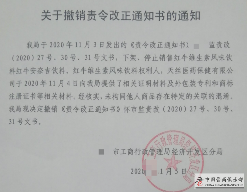 声明中,天丝也对此做了解释,原来对方拿到这份保全裁定的当天就通过市场监督管理针对天丝的红牛产品要求下架。随后天丝也马上以商标权利人的身份向相关部门提交了材料,经核实已经撤销和纠正了针对天丝授权产品的行政文书及行为,维护了经营秩序。
